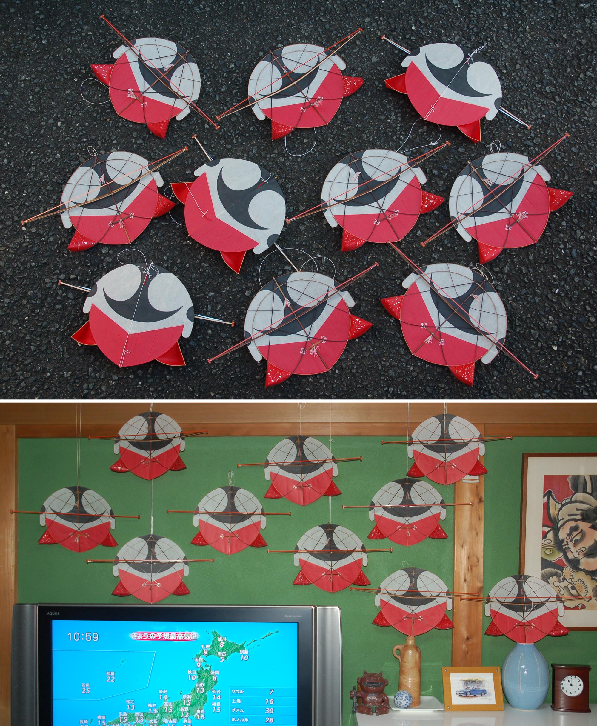 丸形の凧3点は、スパン1メートル弱の風袋凧で常にくねくねと揺れながら上がります。3点もほぼ同じ時期に作ったのは風袋(袖)の深さを変えて性能をチエックしようとしたもので、それなりの趣があります。六角凧はスパン120〜160センチ。