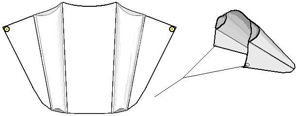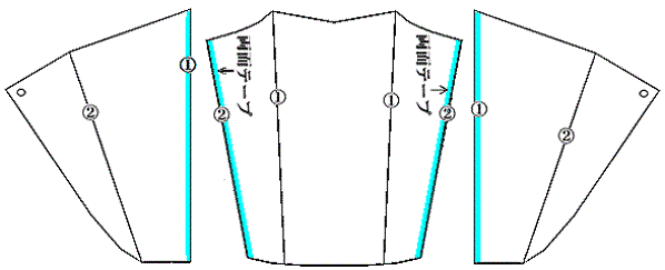 | 胴体部分と左右の安定翼部分から構成されます。図の位置には両面テープが貼ってあります。 ピンで目印を付けてあります。 | |